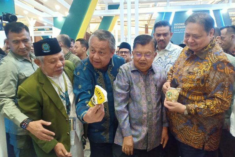 Gubernur BI Perry Warjiyo, mantan Wakil Presiden Indonesia Jusuf Kalla, dan Wakil Presiden Indonesia saat melakukan tour booth di ISEF 2024.