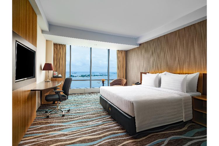 Kamar dengan pemandangan langsung ke Pantai Losari di Swiss-Belhotel Makassar, pilihan sempurna untuk merayakan malam pergantian tahun dengan kenyamanan dan keindahan