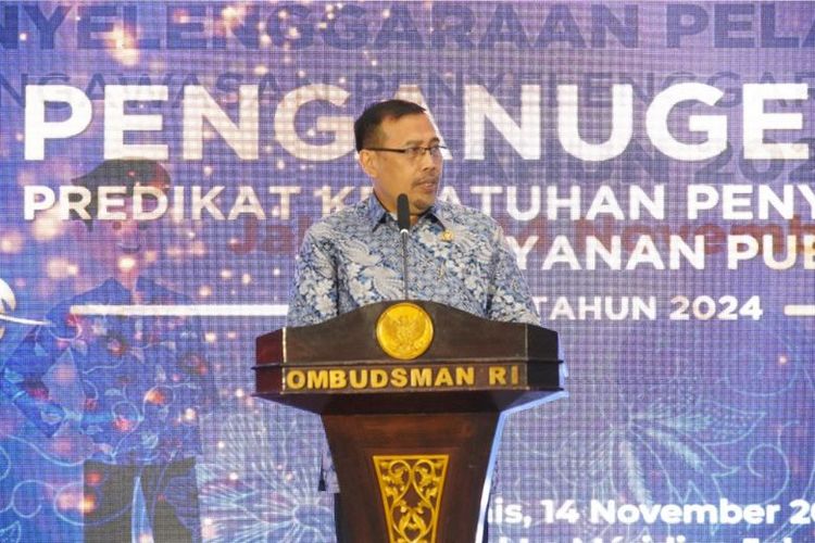 Ketua Ombudsman RI Mokhammad Najih memberikan sambutan dalam acara penganugerahan Penilaian Kepatuhan Penyelenggaraan Pelayanan Publik Tahun 2024 yang digelar di Hotel Le Meridien Jakarta, Kamis (14/11/2024).