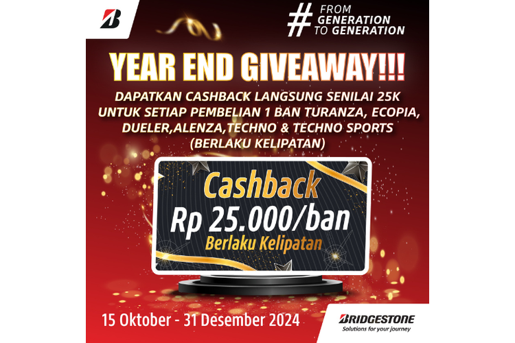 Program Year End Giveaway diadakan Bridgestone Indonesia mulai dari Selasa (15/10/2024) hingga Selasa (31/12/2024). Banyak hadiah menarik dan cashback.