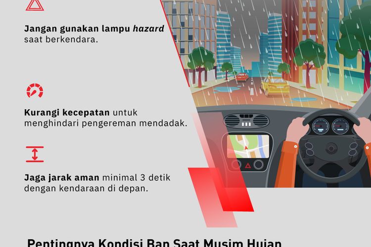 Infografis tip aman berkendara dan perawatan ban di musim hujan.