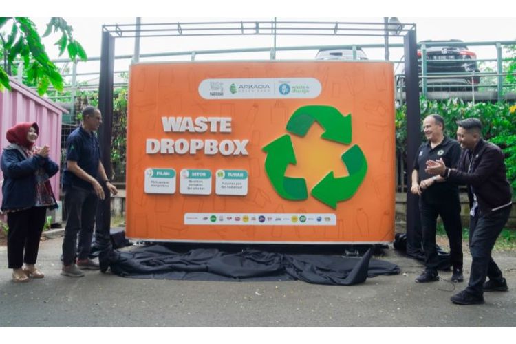 Samer Chedid (kedua kanan) bersama Achmad Umar (kedua kiri) didampingi oleh Direktur Corporate Affairs and Sustainability PT Nestlé Indonesia Sufintri Rahayu (kiri) dan Mohamad Bijaksana Junerosano (kanan) secara resmi meluncurkan fasilitas Waste Dropbox di area Perkantoran Arkadia Green Park, Rabu (28/8/2024).(Dok. Nestle)