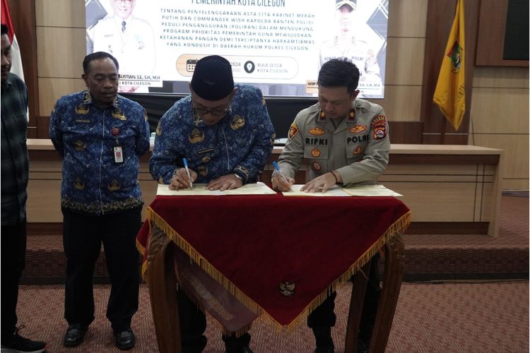 Penandatanganan MoU dalam rangka penyelenggaraan Program Poliran oleh Pemkot dan Polri Cilegon di Aula Setda Kota Cilegon, Banten, Selasa (17/12/2024).