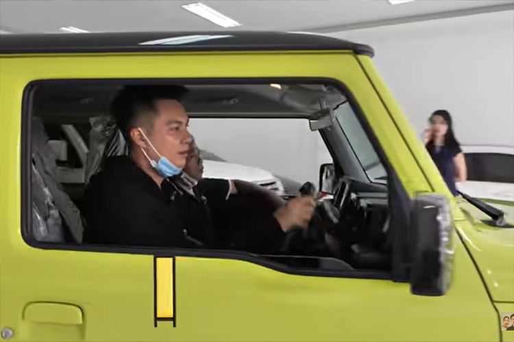 Baim Wong saat mencoba mengemudikan Jimny 3-pintu berwarna kuning untuk anaknya.