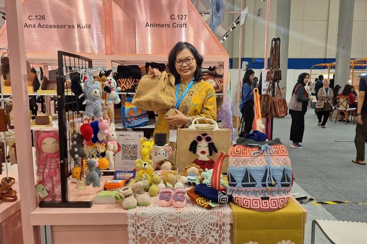 Pendiri Animers Craft Anita M Simamora memamerkan produk rajutan handmade di BRI UMKM Expo(RT) 2025, ICE BSD City, Tangerang.