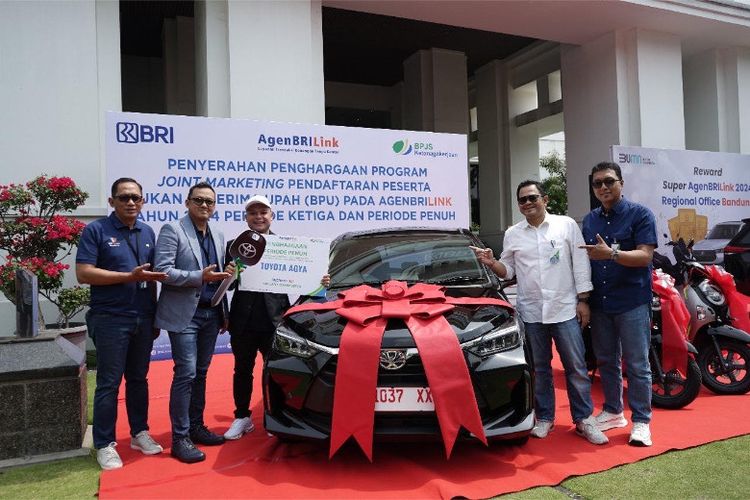 Penyerahan grand prize kepada AgenBRILink BRILIANT COMMUNICA, Narsun, dalam program Kebut Pendaftaran BPJS Ketenagakerjaan