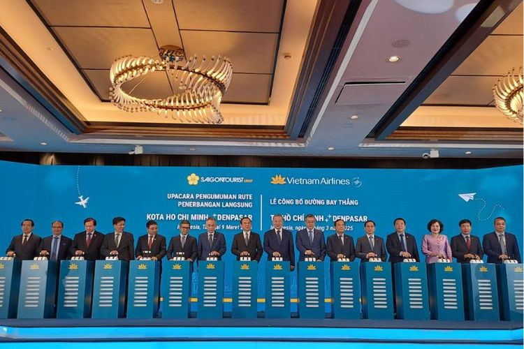 Sekretaris Jenderal Partai Tô Lâm dan para delegasi meluncurkan rute langsung Vietnam Airlines yang menghubungkan Kota Ho Chi Minh dan Denpasar di Hotel Mandarin Oriental, Jakarta, Minggu (9/3/2025).