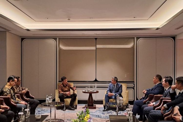 Chairman Vietnam Airlines Mr Dang Ngoc Hoa bertemu dengan Direktur Utama (Dirut) Garuda Indonesia Wamildan Tsani Panjaitan di sela-sela peluncuran rute baru Vietnam Airlines Ho Chi Minh-Denpasar di Mandarin Oriental Hotel, Jakarta, Minggu (9/3/2025).(Dok. KOMPAS.com/ Yakob Arfin T Sasongko)