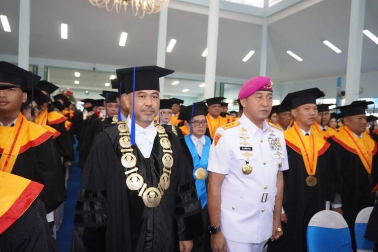 Rektor Universitas Hang Tuah Laksamana Muda TNI (Purn) Dr Ir Avando Bastari, M Phil, M Tr Opsla, IPM, ASEAN Eng bersama Komandan Komando Pembinaan Doktrin, Pendidikan, dan Latihan TNI Angkatan Laut (Dankodiklatal), mewakili Kepala Staf TNI Angkatan Laut (Kasal). (Dok. Universitas Hang Tuah)