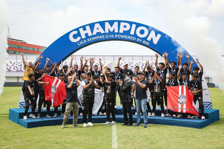 Pemain dan Offisial Babek Soccer School merayakan gelar juara Liga Kompas U-14 Powered