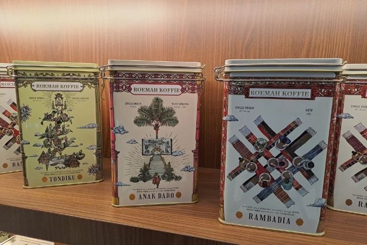 Koffie Tins merupakan biji kopi premium yang dikemas dalam kaleng eksklusif dengan sentuhan budaya lokal pada setiap varian. Ketiga varian yang diluncurkan adalah Rambadia, Anak Daro, dan Tondiku. Masing-masing mewakili kekayaan cita rasa dan cerita budaya dari Sumatera. (Dok. KOMPAS.com/ Yakob Arfin T Sasongko)