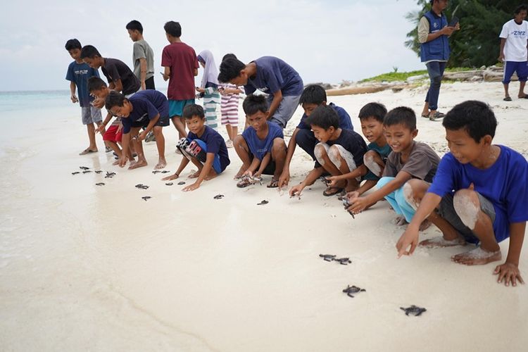 Pelepasan tukik yang dilakukan oleh masyarakat lokal yang telah bekerja sama dengan Telkom.