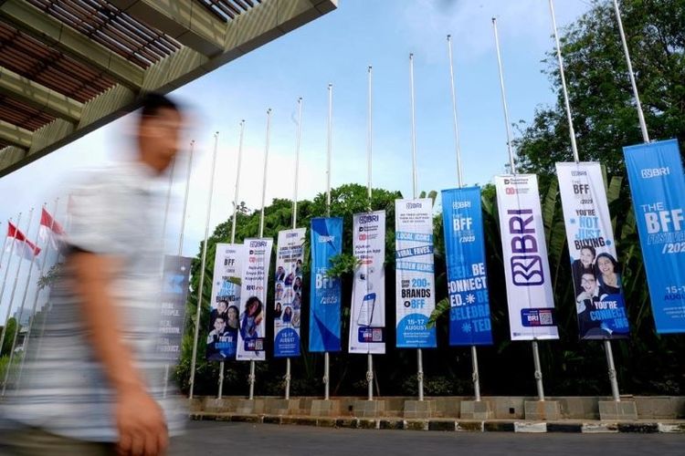 Spanduk dan baliho gelaran Beauty, Fashion, and Fragrance Festival (BFF) 2025 terpajang di area luar Jakarta International Convention Center (JICC) menandai kolaborasi BRI sebagai sponsor utama ajang.