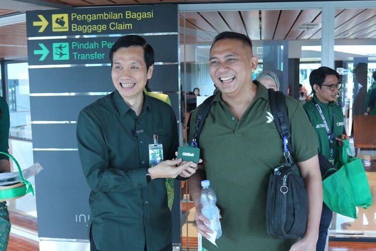 Direktur Utama Citilink Darsito Hendroseputro menyapa dan membagikan merchandise eksklusif kepada penumpang Citilink di Bandara Internasional Soekarno-Hatta, Kamis (4/9/2025).(Dok. Citilink)