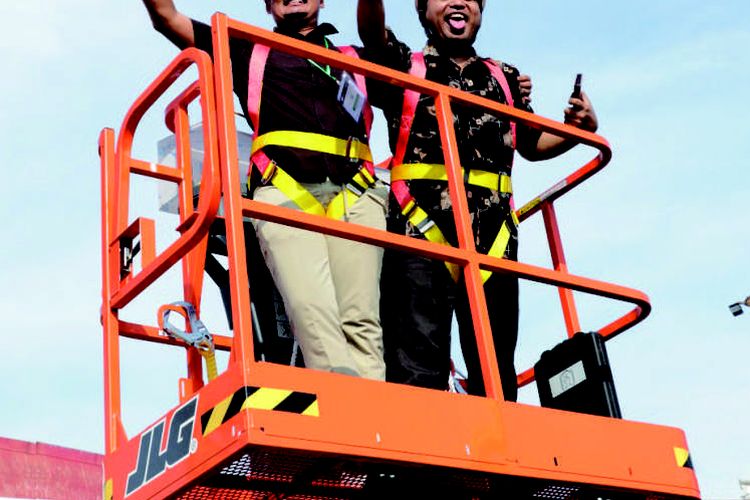 Demo unit JLG Boom Lift dengan visitor di booth Traktor Nusantara