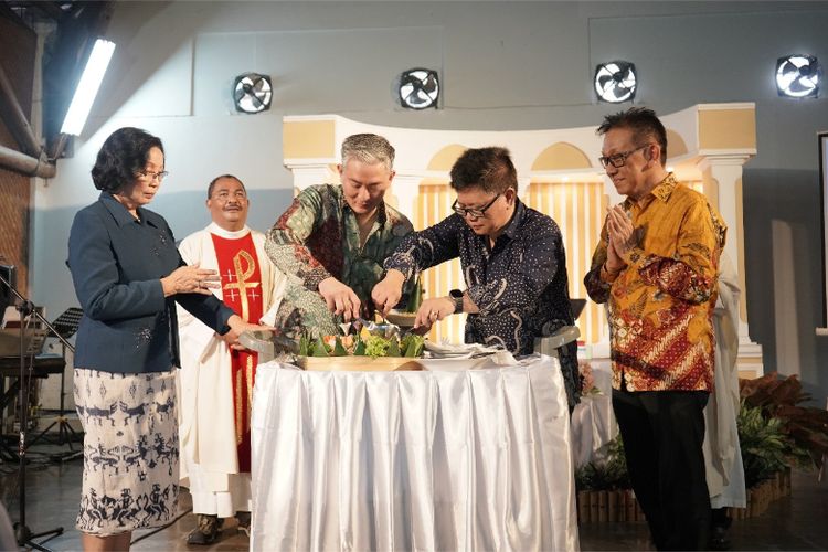 Manajemen PT Nojorono Tobacco International memotong tumpeng dalam rangka perayaan HUT ke-93 Nojorono.
