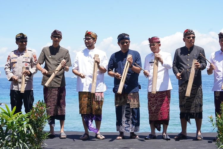 Pembukaan Nusa Penida Festival 2025 ditandai dengan pemukulan kentongan (kulkul) oleh Bupati Klungkung I Made Satria, Wakil Bupati (Wabup) Klungkung Tjokorda Gde Surya Putra, Bupati Bandung Barat Jeje Ritchie Ismail, serta sejumlah tamu undangan lainny. (DOK. Pemkab Klungkung)