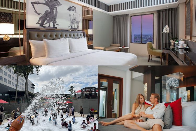 Atas: Kamar Deluxe di The Alana Hotel & Conference Center Malioboro. Kiri bawah: Foam Party at Aston Serang Hotel and Convention Center. Kanan bawah: Suasana di Royal Kamuela Villas & Suite at Monkey Forest Ubud.