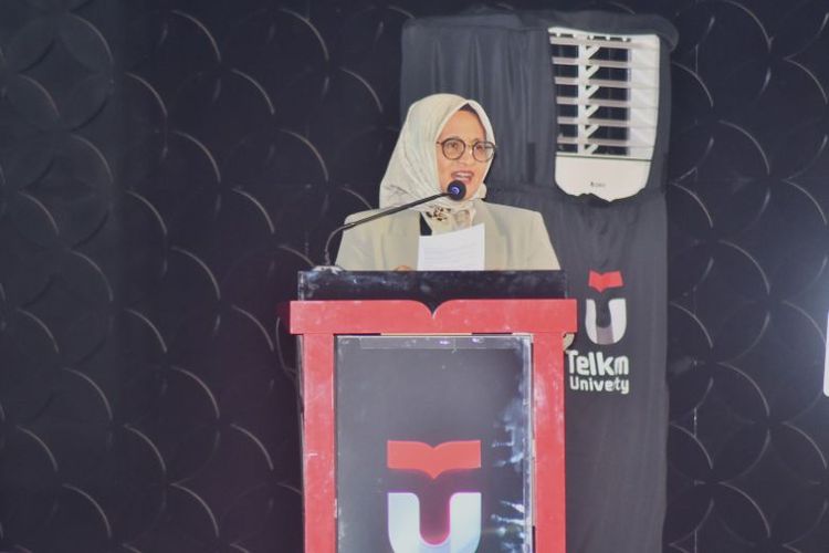 Direktur Utama Telkom Dian Siswarini memberikan sambutan dalam agenda Sidang Terbuka Senat Wisuda Telkom University Periode II Tahun Akademik 2025/2026 yang digelar di Telkom University Convention Hall, Bandung, Sabtu (25/4).