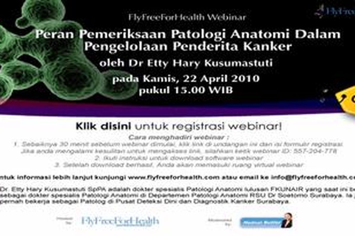 Seminar online dengan topik “Peran Pemeriksaan Patologi Anatomi dalam Pengelolaan Penderita Kanker” akan diselenggarakan pada Kamis, 22 April 2010 pukul 15.00 WIB. Siapkan perangkat komputer Anda, koneksikan internet dan speaker untuk mengikuti presentasi dari Dr Etty mengenai topik menarik ini. Anda pun dapat bebas memberikan pertanyaan yang akan langsung di jawab, gratis!