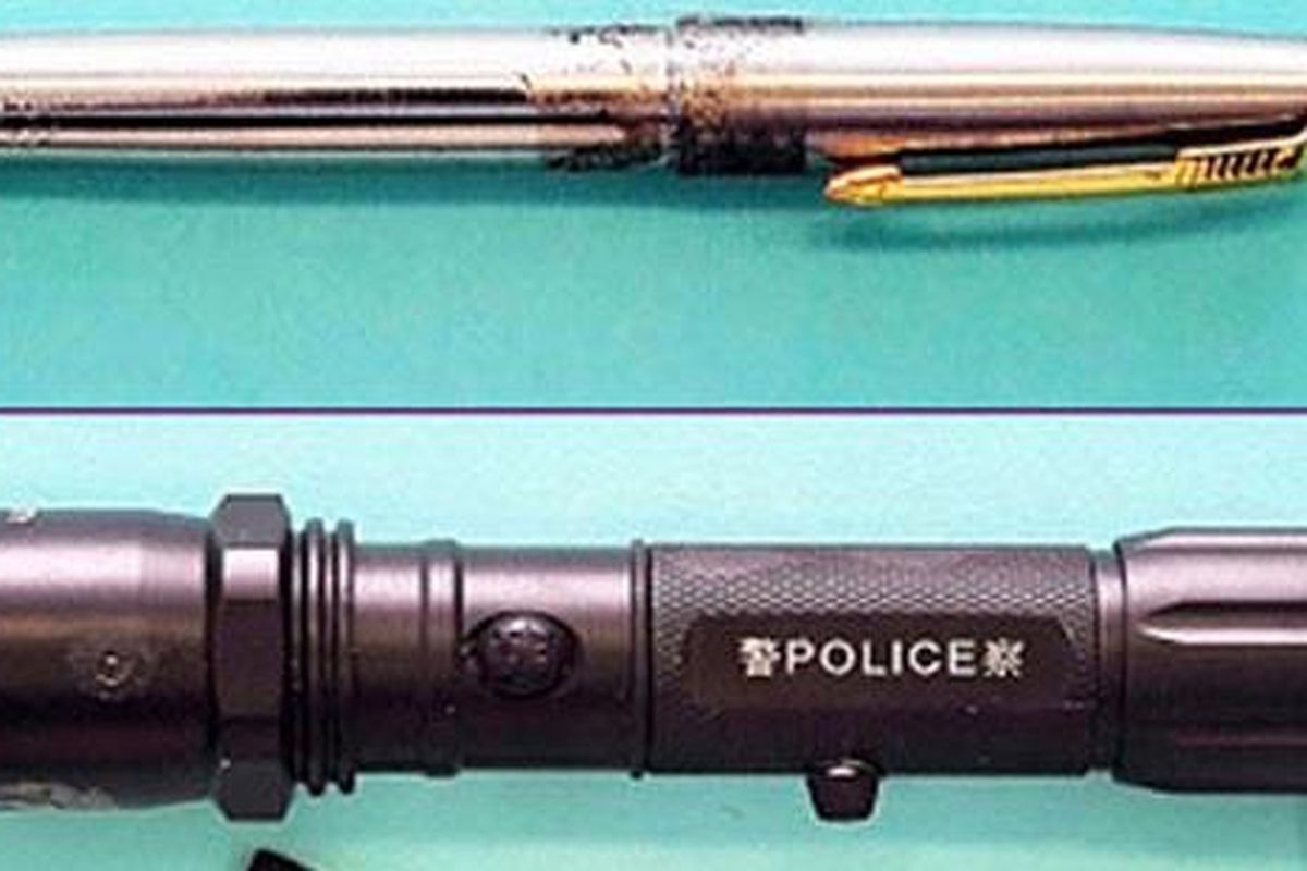 Salah satu senjata itu berbentuk senter yang bisa menembakkan peluru berlapis racun. Jarak tembak senter bertuliskan "police" ini mencapai 9 meter.