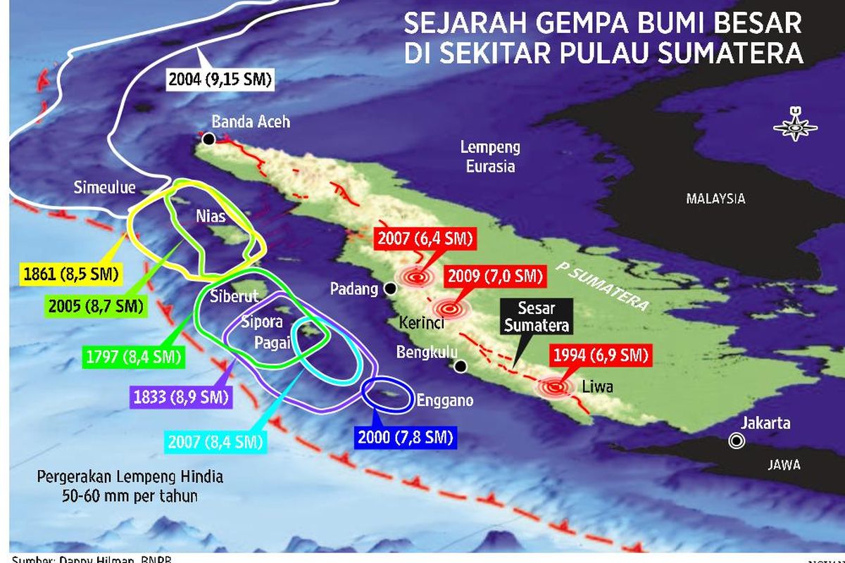Menurut Irwan Meilano dari Fakultas Ilmu dan Teknologi Kebumian ITB, hampir semua gempa besar di Sumatera terjadi di zona subduksi. ”Gempa besar yang bersumber di sesar aktif di daratan Sumatera hanya sedikit, antara lain gempa Singkarak (2007) dan gempa Liwa (1994),” ujarnya.