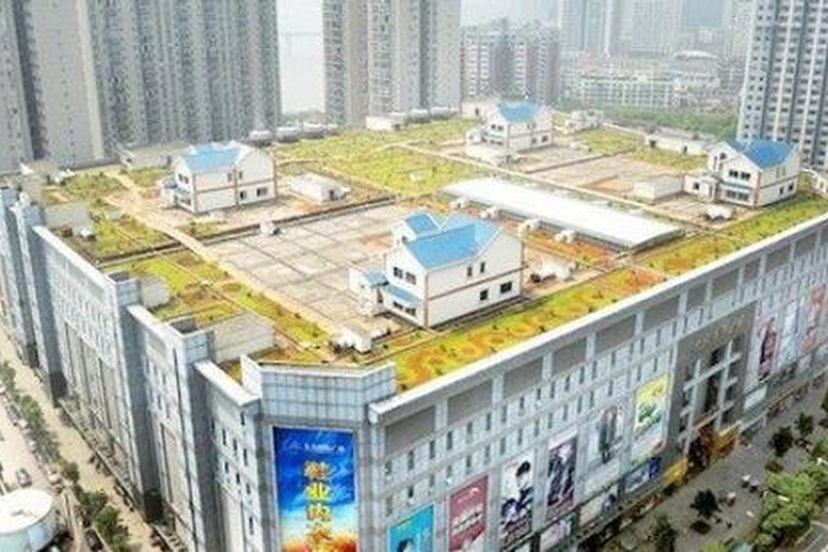 Setidaknya, hal itu bukan halangan bagi pengembang Jiutian International Square. Gedung ini adalah sebuah pusat perbelanjaan setinggi delapan lantai di Zhuzhou. Jiutian membangun empat vila di atas mal ini, yang bahkan lengkap dengan taman di masing-masing vila.