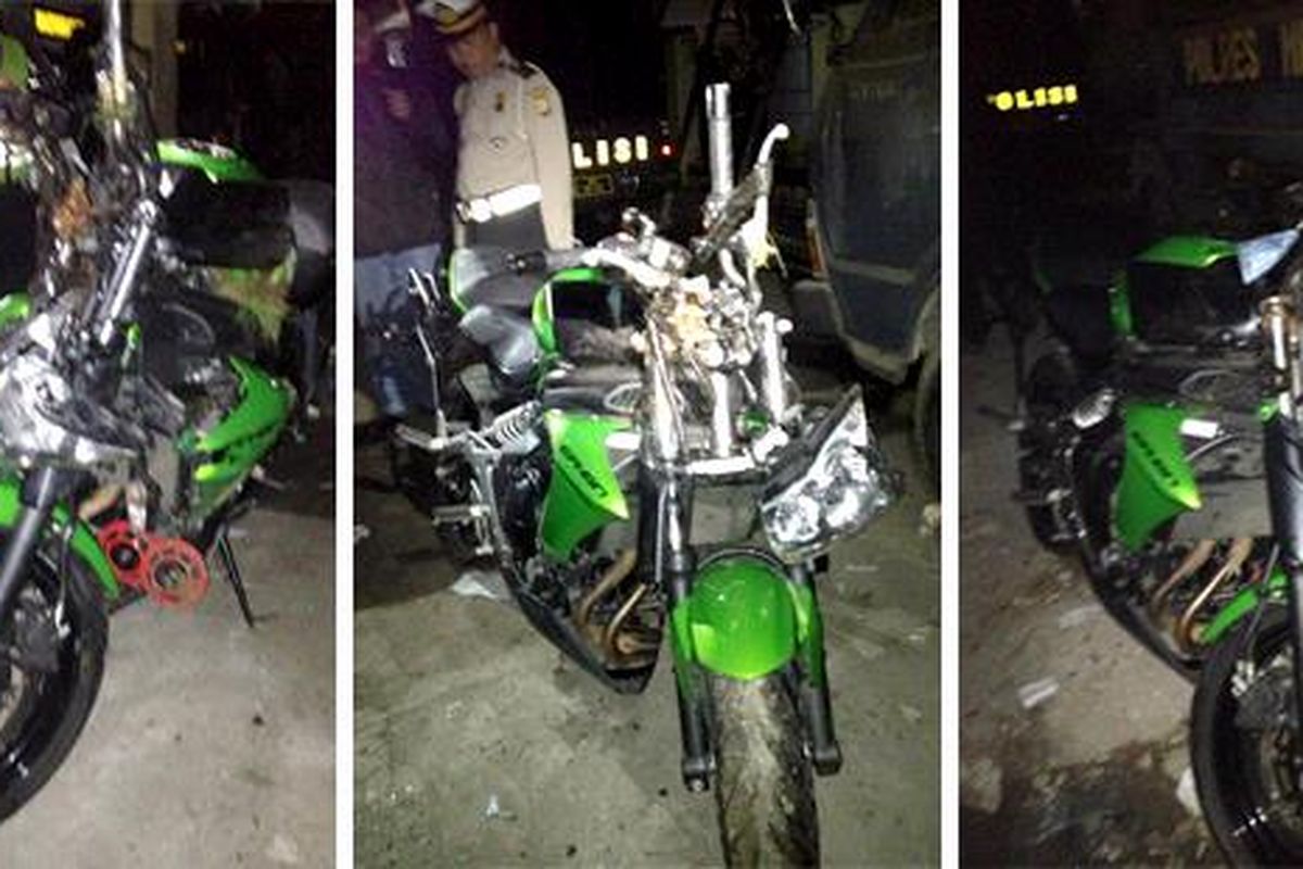 Berikut foto-foto kondisi motor Uje yang didapat Kompas.com dari Traffic Management Center Polda Metro Jaya, Jumat. Motor Kawasaki Ninja ER-6n warna hijau yang dikendarai Uje tampak hancur pada bagian depan.