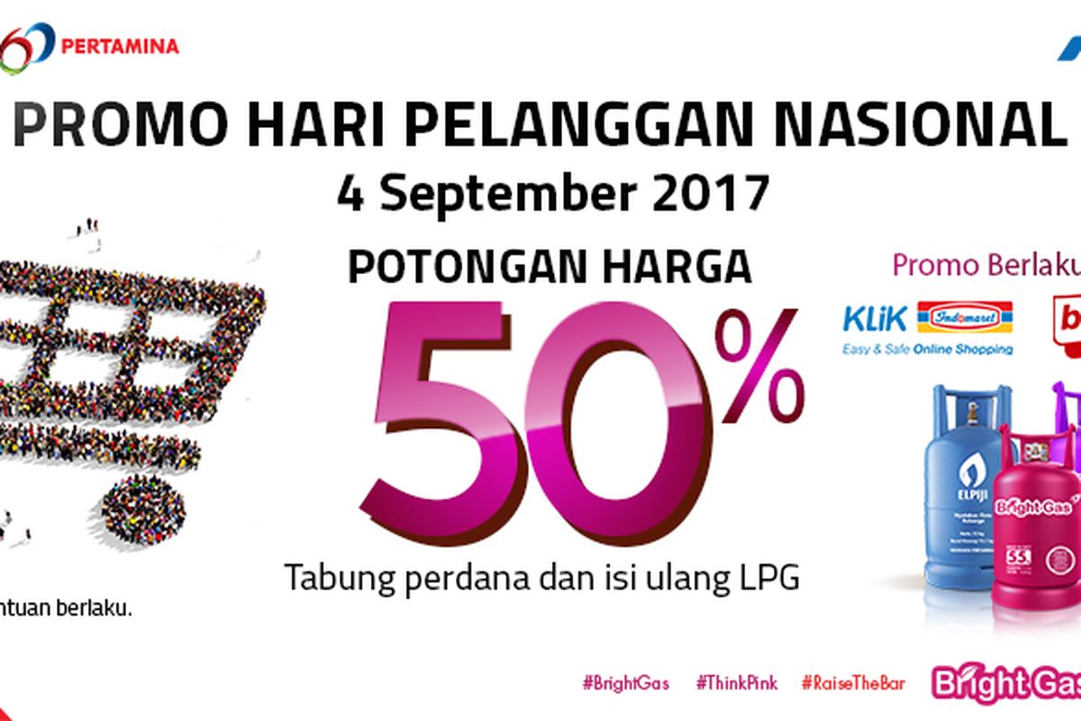 Kabar gembiranya, misi untuk melakukan penghematan bisa dilakukan bulan ini. Pasalnya, Pertamina memberi diskon besar-besaran untuk pembelian Bright Gas 5,5 kilogram, Bright Gas 12 kilogram, dan ELPIJI 12 kilogram. Potongan harga ini akan diberikan tepat pada Hari Pelanggan Nasional yang jatuh pada tanggal 4 September 2017.