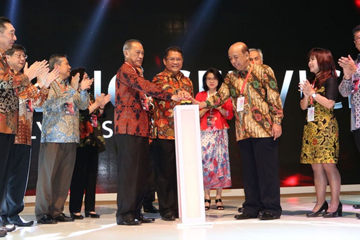-Presiden Direktur PT Bank Central Asia Tbk (BCA) Jahja Setiaatmadja, yang didampingi jajaran direksi BCA, menyerahkan plakat apresiasi kepada Menteri Energi dan Sumber Daya Mineral Republik Indonesia Ignasius Jonan usai memberikan inspiring closing speech dalam ajang Indonesia Knowledge Forum VI di Jakarta, Rabu (04/10/2017). (Dok. BCA)