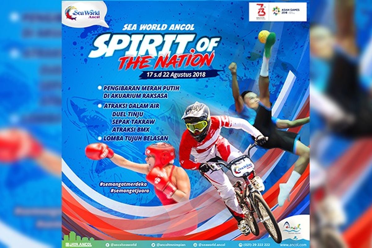 Dalam rangka turut memeriahkan perhelatan akbar yang akan dimulai tanggal 18 Agustus nanti, Seaworld Ancol pun telah menyiapkan program istimewa. Dengan mengangkat tema “Spirit of The Nation” untuk bulan Agustus ini, menggaungkan semangat merdeka untuk menjadi juara di rumah sendiri dan menuangkannya dalam tagar #semangatmerdeka dan #semangatjuara di media sosialnya.