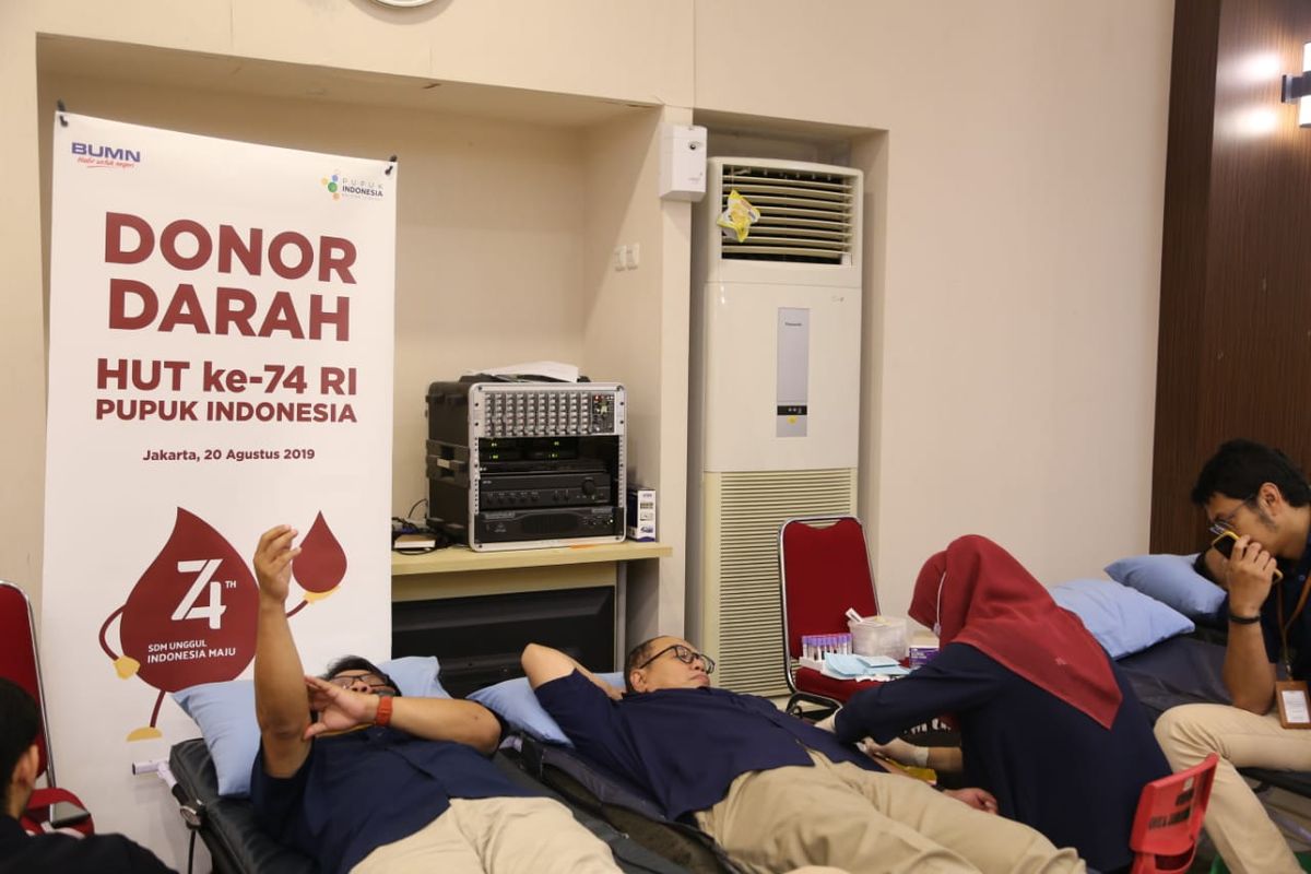 JAKARTA, 20 AGUSTUS 2019 - Masih dalam rangka memperingati Hari Ulang Tahun Kemerdekaan Republik Indonesia yang ke-74, pada hari ini (20/8), PT Pupuk Indonesia (Persero) menyelenggarakan kegiatan Donor Darah bekerja sama dengan Palang Merah Indonesia (PMI). Kegiatan yang bertempat di Kantor Pusat Pupuk Indonesia ini merupakan wujud dari kepedulian sosial karyawan perusahaan dan anak usahanya.