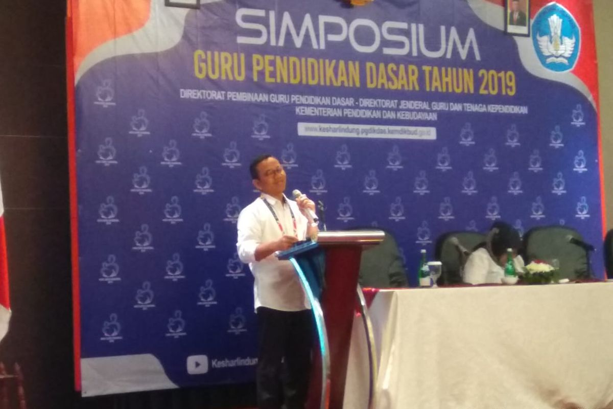 Kasubdit Kesharlindung Dit PG Dikdas saat membuka simposium guru di Jakarta, Kamis (28/11/2019)"Anak sekarang lebih banyak waktu mengakses informasi dari HP nya ketimbang gurunya. Oleh karena itu guru juga harus punya kemampuan menyesuaikan zaman. Harus bisa memberikan solusi terhadap perubahan sesuai zamannya," tutur Eddy Tejo.
