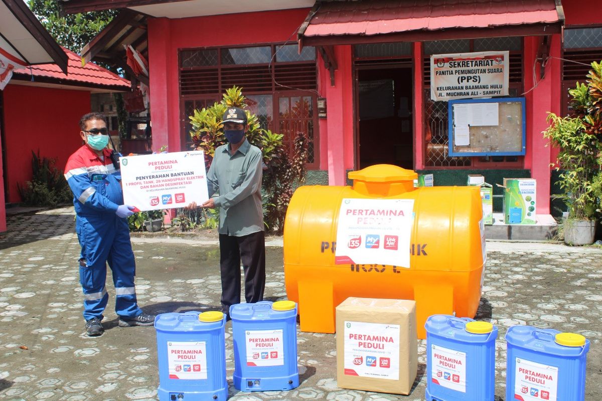 “Kami memberikan bantuan berupa tendon air dan alat semprot sebanyak 28 unit yang diharapkan dapat membantu mencegah dan menekan penyebaran Covid-19 ini,” ujar Rachmat Kurnia Damanik selaku Fuel Terminal Manager Sampit.