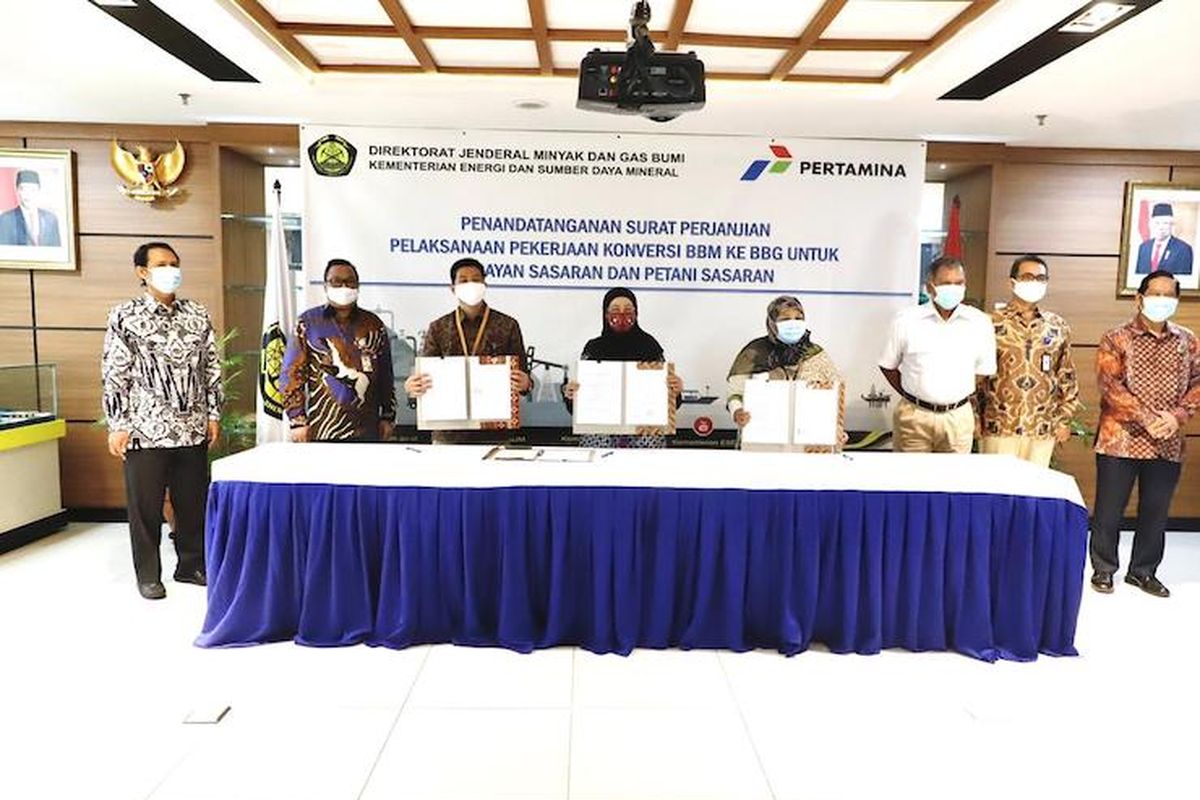 Surat perjanjian tersebut ditanda tangani oleh Pejabat Pembuat Komitmen Konversi BBM k BBG untuk Nelayan Sasaran Irene Yulianingsih, VP LPG Sales PT Pertamina (Persero) Primarini, dan Pejabat Pembuat Komitmen Konversi BBM ke BBG untuk Petani Sasaran Safriyanto.
