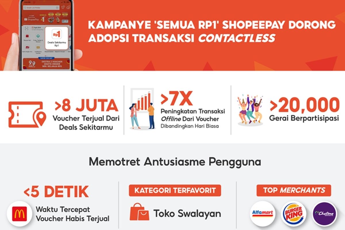 Sebagai informasi, lebih dari 20.000 gerai merchant telah berpartisipasi dalam kampanye “Semua Rp1”. Voucher dari brand-brand ternama, seperti Alfamart, Burger King, dan Chatime, menjadi incaran utama pengguna ShopeePay.
