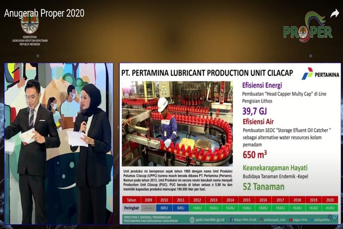 Jakarta, 15 Desember 2020 - PT Pertamina Lubricants, anak usaha PT Pertamina (Persero) yang bergerak dibidang pelumas, melalui dua pabrik pelumasnya, Production Unit Cilacap (PUC) dan Production Unit Gresik (PUG) kembali mempertahankan prestasi dalam bidang lingkungan hidup dan tanggung jawab sosial dengan meraih penghargaan Predikat Hijau dalam program Penilaian Peringkat Kinerja Perusahaan dalam Pengelolaan Lingkungan (PROPER) yang diselenggarakan oleh Kementerian Lingkungan Hidup dan Kehutanan (KLHK), Senin (14/12).