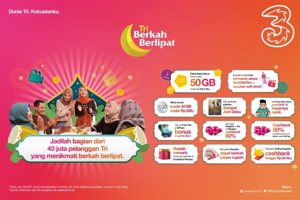 “Untuk menemani pelanggan menjalani bulan suci Ramadhan, 3 Indonesia hadirkan program #TriBerkahBerlipat dengan berbagai rangkaian produk disertai manfaat berlipat bagi pelanggan,” ujar Chief Marketing Officer 3 Indonesia Dolly Susanto dalam rilis yang diterima Kompas.com, Senin (19/4/2021).
