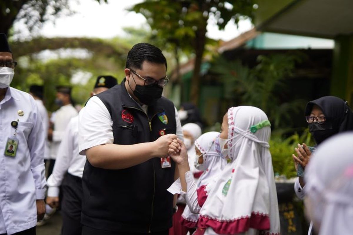 KOMPAS.com - Bupati Kediri Hanindhito Himawan Pramono membuka vaksinasi perdana untuk anak usia 6-11 tahun di Madrasah Ibtidaiyah Negerti (MIN) 2 Kediri pada Senin 20/12/2021.