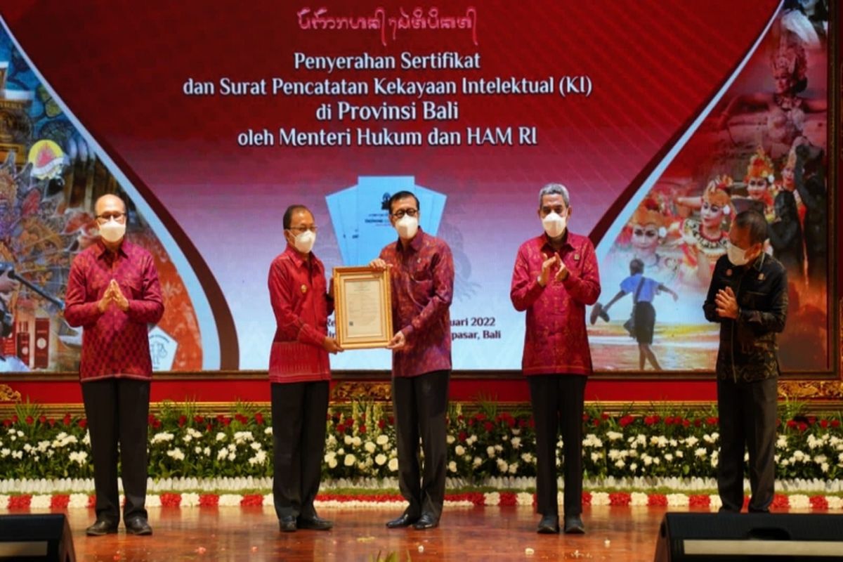 Hal tersebut ia ungkapkan bertepatan dengan momen penyerahan 46 surat pencatatan ciptaan dan 17 sertifikat merek kepada Gubernur Bali Wayan Koster di Taman Werdhi Art Center, Bali, Minggu (16/1/2022).