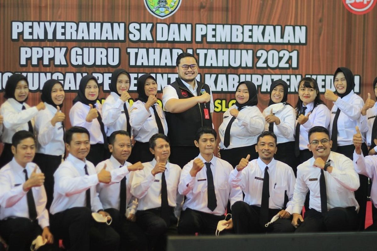 KOMPAS.com – Bupati Kediri Hanindhito Himawan Pramana menyerahkan Surat Keputusan (SK) Pegawai Pemerintah dengan Perjanjian Kerja (PPPK) Tahap 1 Tahun 2021 kepada 698 guru di lingkungan Pemerintahan Kabupaten (Pemkab) Kediri, Jawa Timur, Rabu (20/4/2022).
