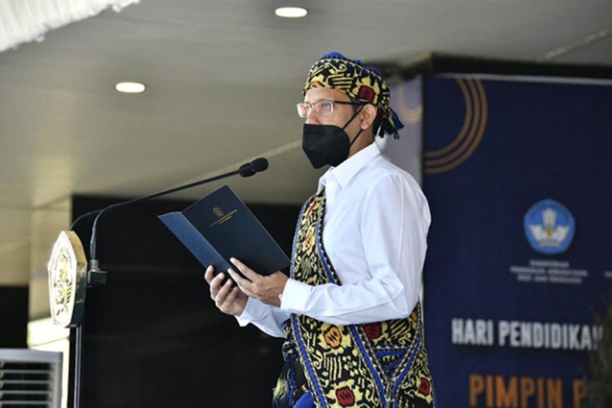 Bertindak sebagai pembina upacara, Menteri Pendidikan, Kebudayaan, Riset, dan Teknologi (Mendikbud Ristek) Nadiem Anwar Makarim mengenakan pakaian adat dari Flores, Nusa Tenggara Timur. Ia menjelaskan tema peringatan Hardiknas 2022 adalah “Pimpin Pemulihan, Bergerak untuk Merdeka Belajar”.