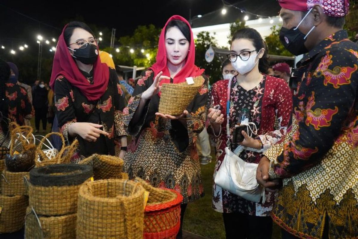 Ketua Dekranasda Jatim Arumi Bachsin bersama Ketua Dekranasda Kabupaten Kediri Eriani Annisa Hanindhito saat meninjau hasil kreasi perajin asal Kabupaten Kediri.Beberapa hasil kerajinan yang paling menonjol adalah batik, sulaman tangan, tenun, kayu, aksesori, bambu, sabut kelapa, serta batok kelapa.