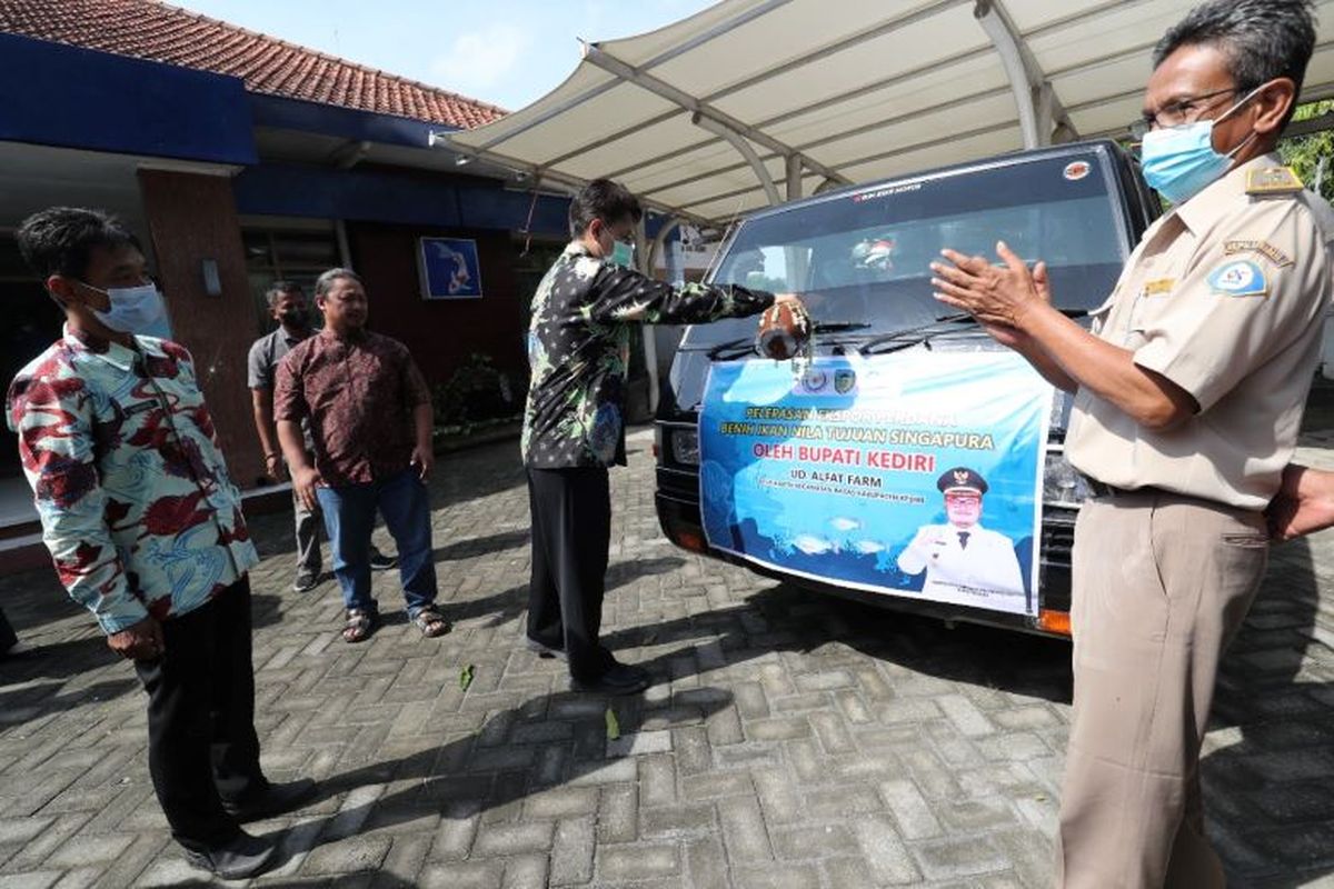 KOMPAS.com - Pemerintah Kabupaten (Pemkab) Kediri melakukan pelepasan perdana ekspor 60.000 bibit ikan nila tujuan Singapura, Jumat (24/6/2022).