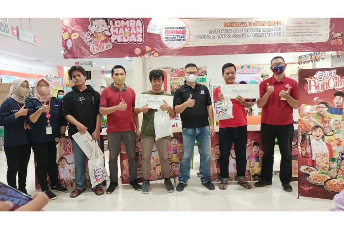 KOMPAS.com - BonCabe sukses melaksanakan Lomba Makan Mie Pedas yang dilakukan secara serentak di delapan cabang Yogya Toserba di Priangan Timur, Jawa Barat, Minggu (3/7/2022).