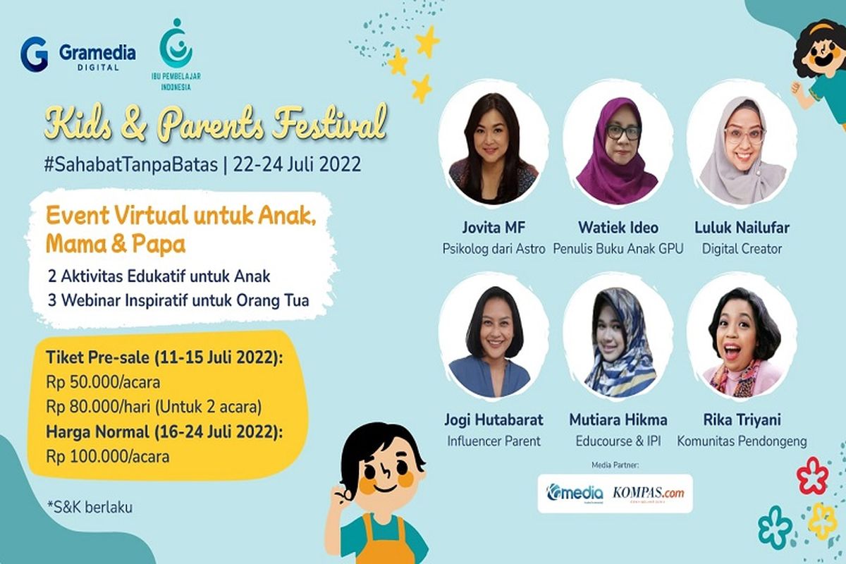 KOMPAS.com - Hari Anak Nasional (HAN) diperingati pada 23 Juli setiap tahun. Untuk menyemarakkan HAN tahun ini, Gramedia Digital bekerja sama dengan komunitas Ibu Pembelajar Indonesia (IPI) menggelar acara "Kids & Parents Festival" pada 22-24 Juli 2022.