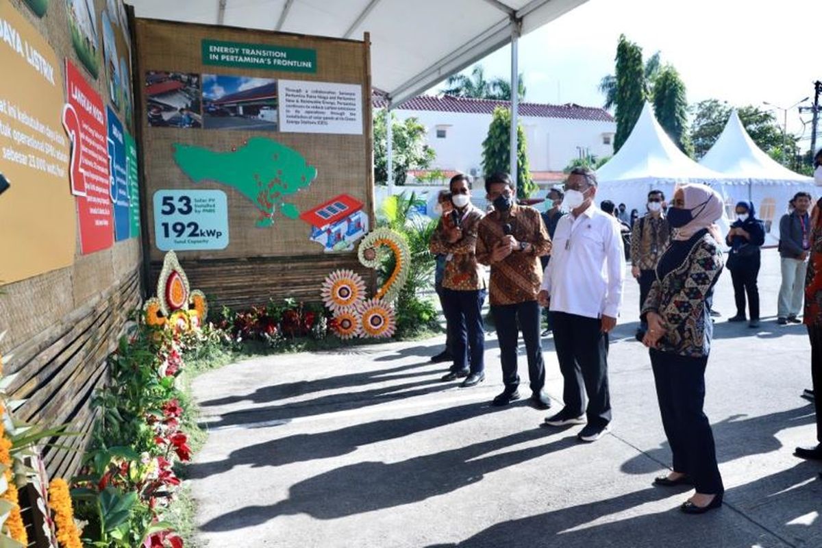KOMPAS.com - Direktur Utama Pertamina Nicke Widyawati bersama Menteri Energi Sumber Daya Mineral (ESDM) Arifin Tasrif meninjau kesiapan Green Energy Station (GES) milik Pertamina di Stasiun Pengisian Bahan Bakar Umum (SPBU) 5180130, Denpasar, Bali, Selasa (30/8/2022).