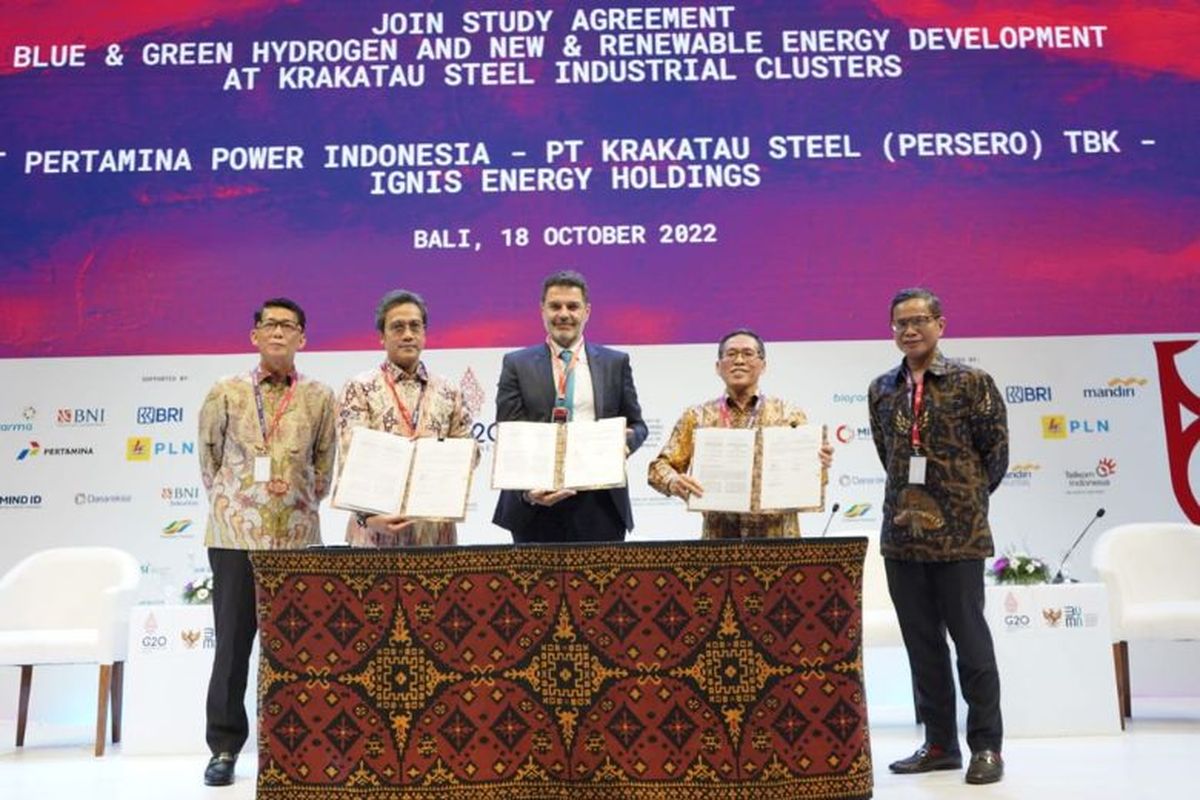 KOMPAS.com – PT Pertamina Power Indonesia (Pertamina NRE), PT Krakatau Steel (Persero) Tbk, dan IGNIS Energy Holding menandatangani joint study agreement (JSA) pengembangan blue and green hydrogen serta energi baru dan terbarukan (EBT) di wilayah industri Krakatau Steel.
