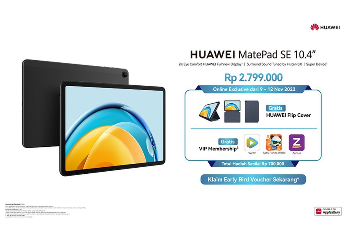 Pada peluncuran Huawei MatePad SE, Huawei menghadirkan berbagai promo menarik bertajuk “Huawei Super Brand Day” secara eksklusif di Tokopedia dan Blibli mulai Selasa (1/11/2022) hingga Jumat (4/11/ 2022).