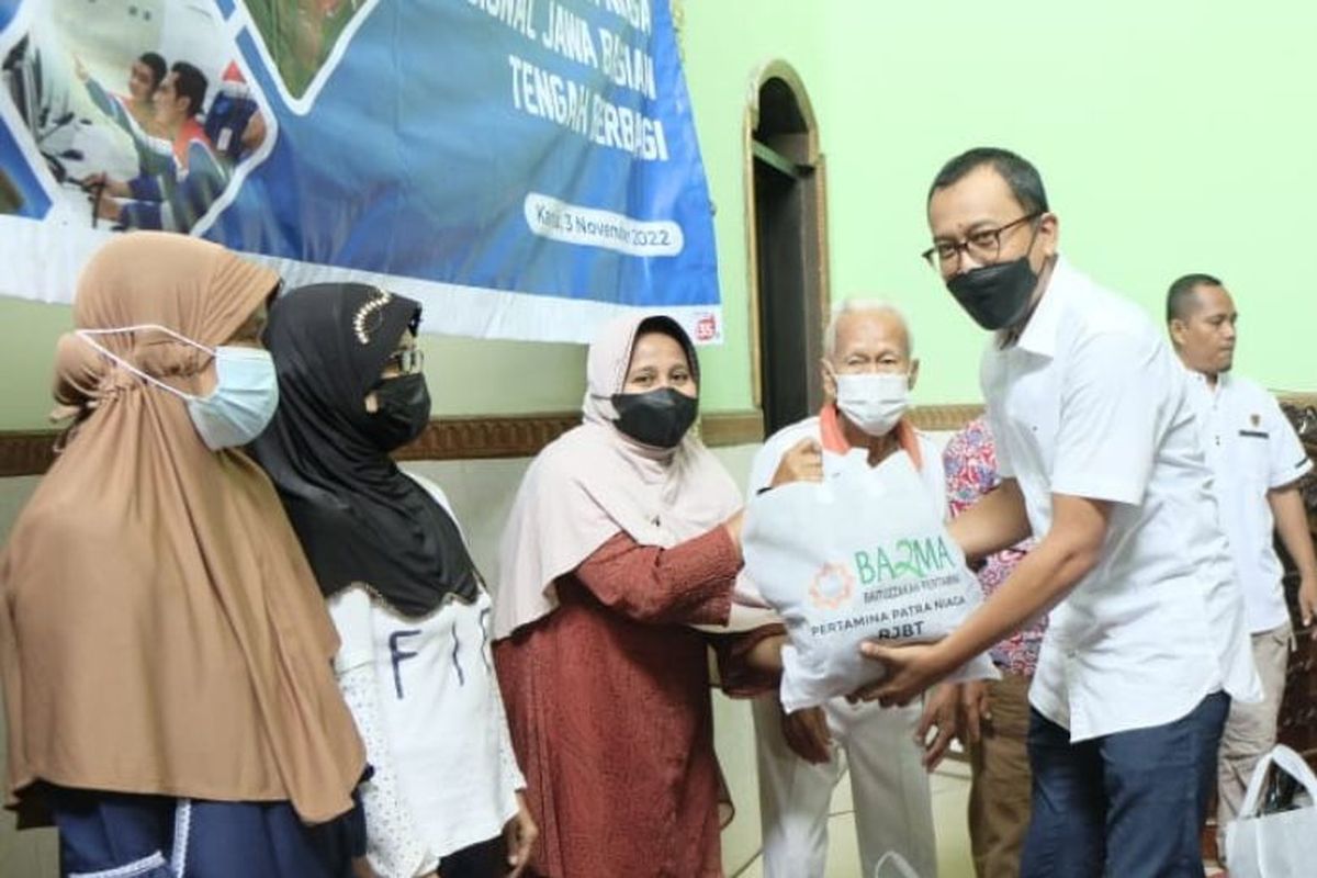 KOMPAS.com – Pertamina Patra Niaga Jawa Bagian Tengah (JBT) melalui Baituzzakah Pertamina (Bazma) melaksanakan pembagian sembako di Masjid Al Huda Kelengan, Kelurahan Kembangsari, Kota Semarang, Jawa Tengah, Kamis (3/11/2022).